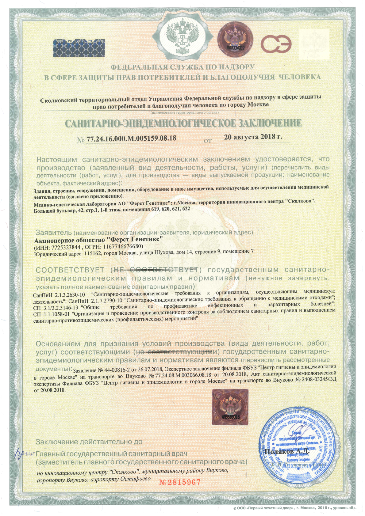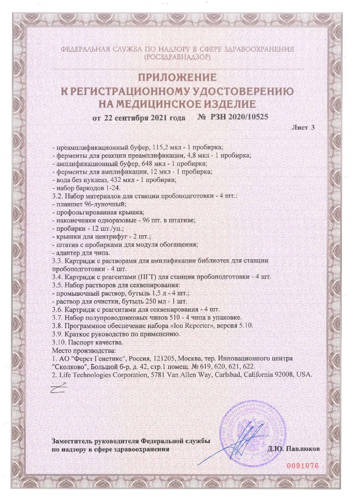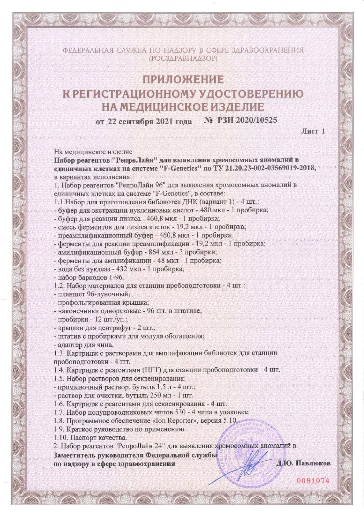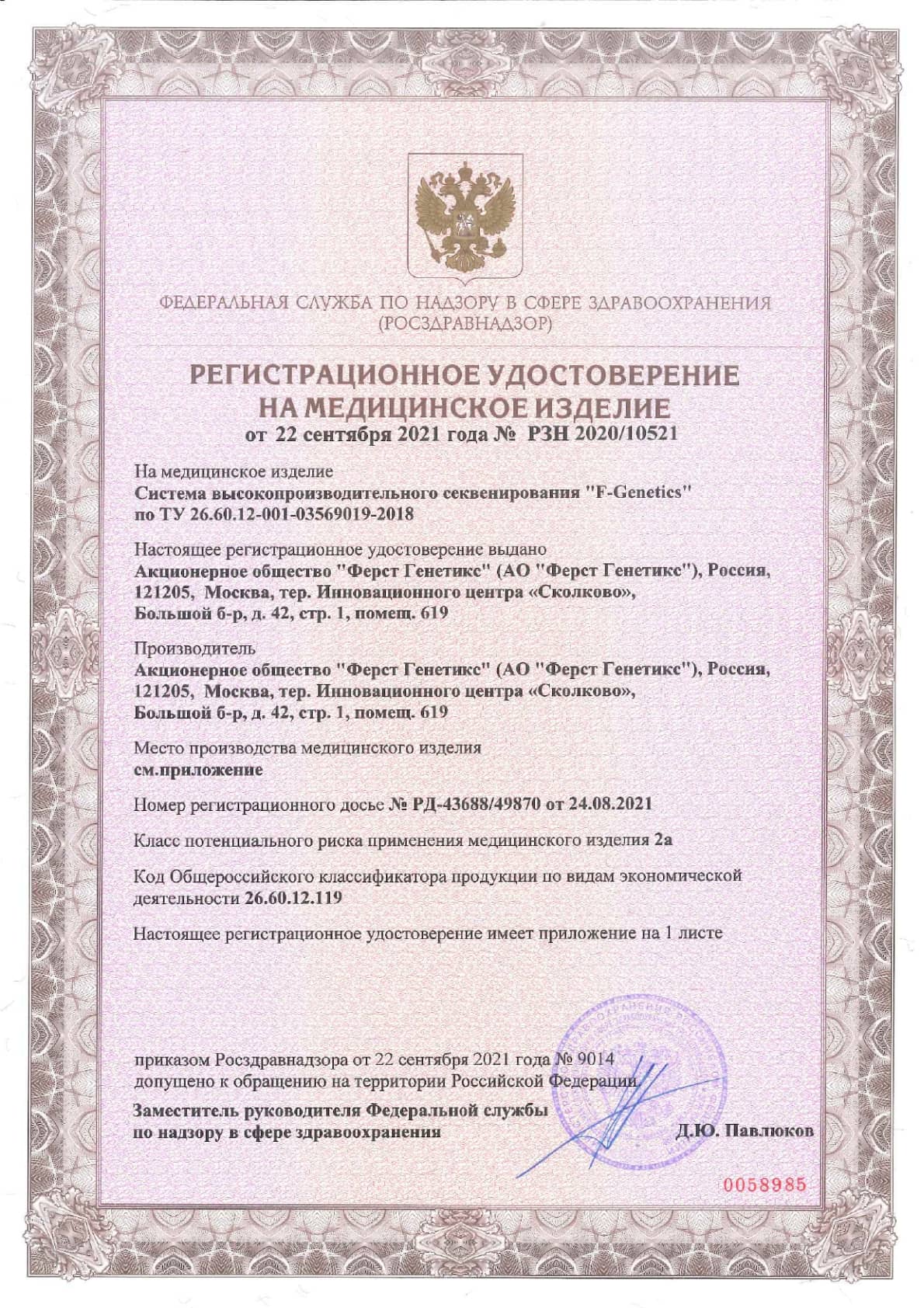 Лаборатория First Genetics проводит исследования с использованием системы высокопроизводительного секвенирования «F-Genetics» и набора реагентов для преимплантационного генетического тестирования «РепроЛайн», зарегистрированных в 2020 году в качестве медицинских изделий (РЗН 2020/10521, РЗН 2020/10525).
