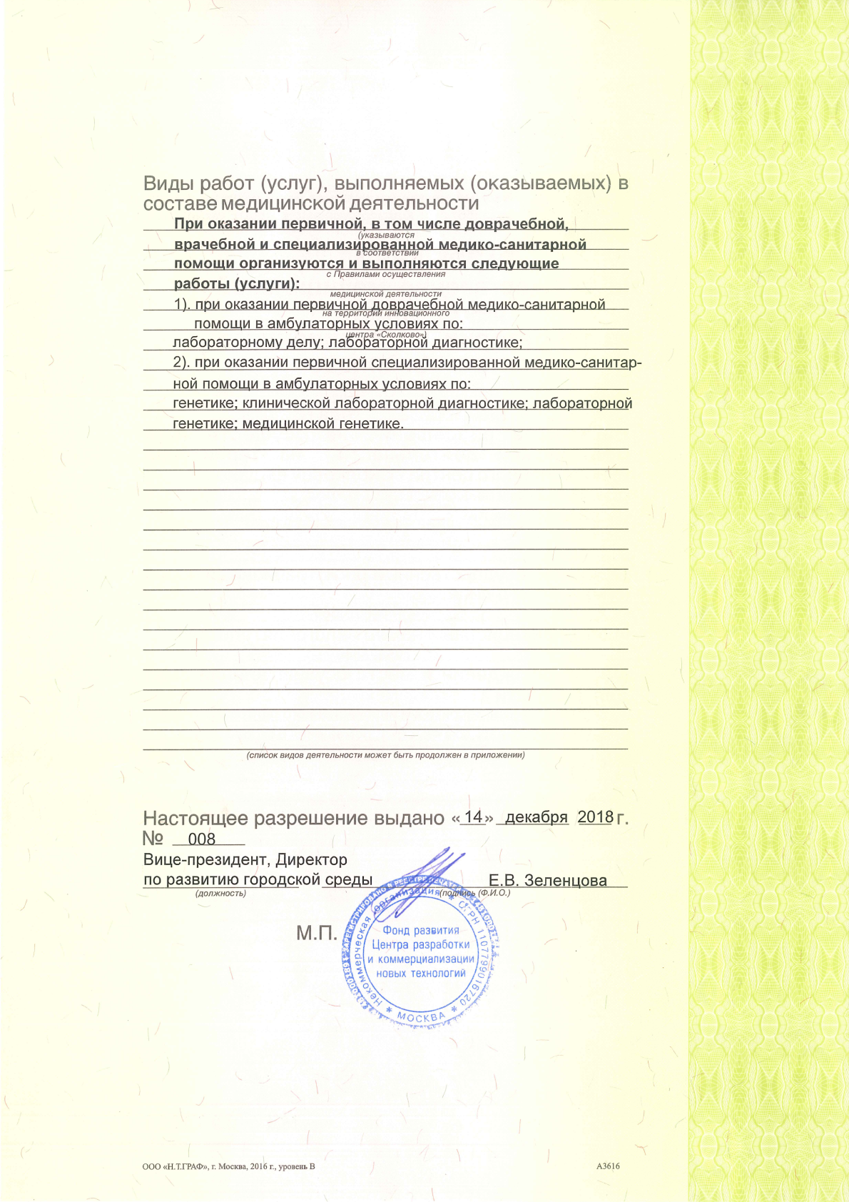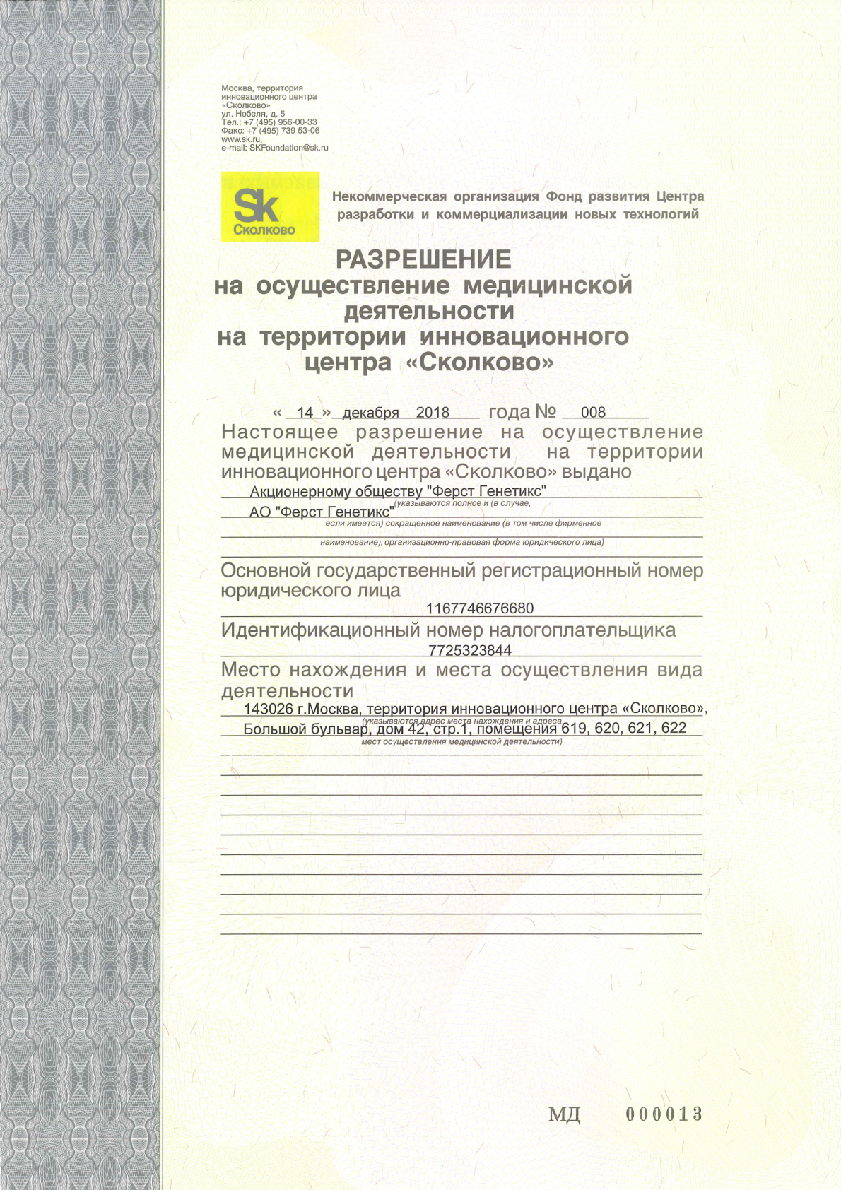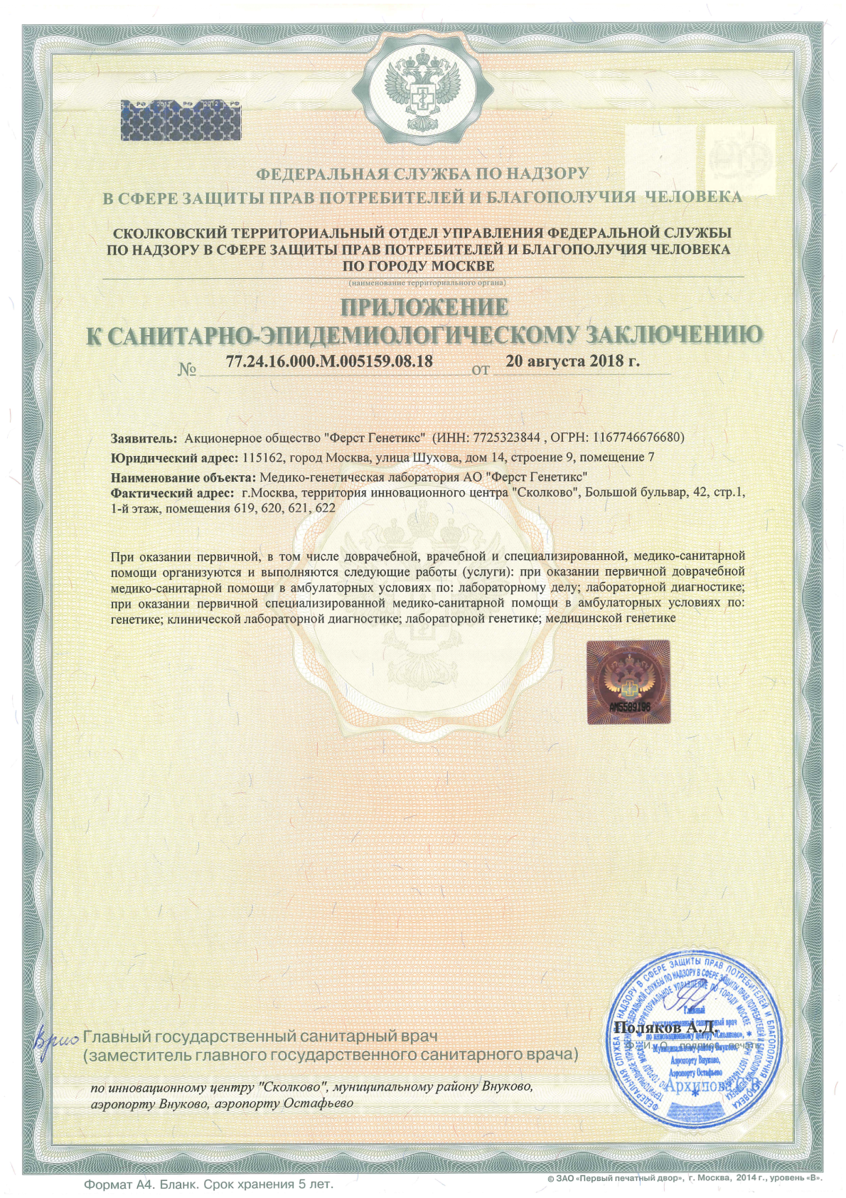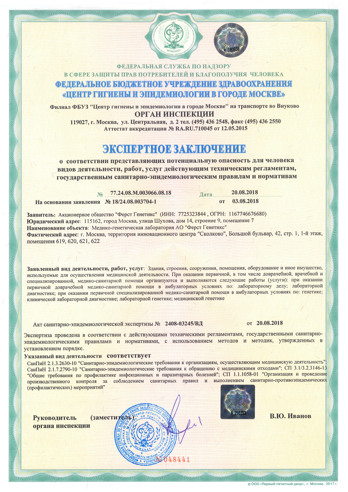 Лаборатория First Genetics проводит исследования с использованием системы высокопроизводительного секвенирования «F-Genetics» и набора реагентов для преимплантационного генетического тестирования «РепроЛайн», зарегистрированных в 2020 году в качестве медицинских изделий (РЗН 2020/10521, РЗН 2020/10525).