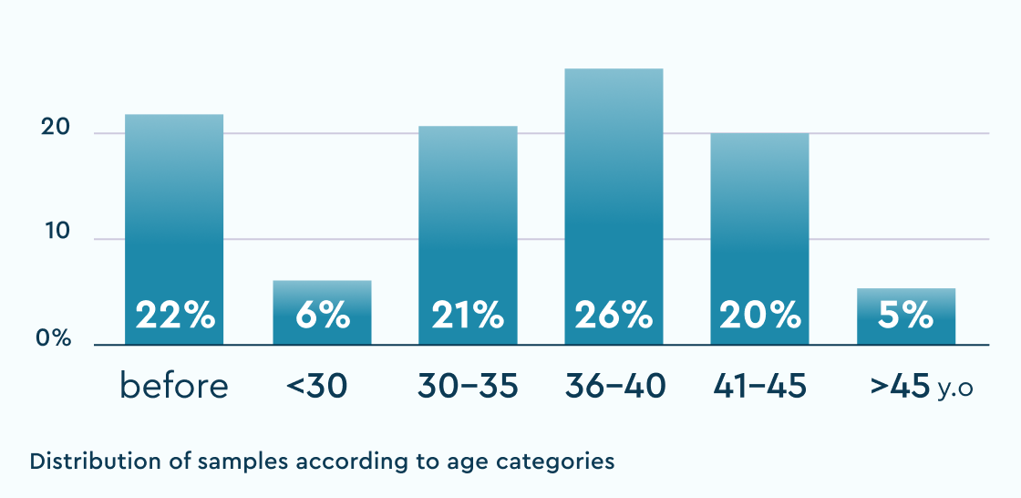 According to world and Russian statistics, the prevalence of chromosomal abnormalities detected in spontaneous abortion ranges from 38% to 76%*. The frequency of aneuploidy in embryos in ART cycles increases with maternal age, reaching 80% in patients over 40 years of age**.